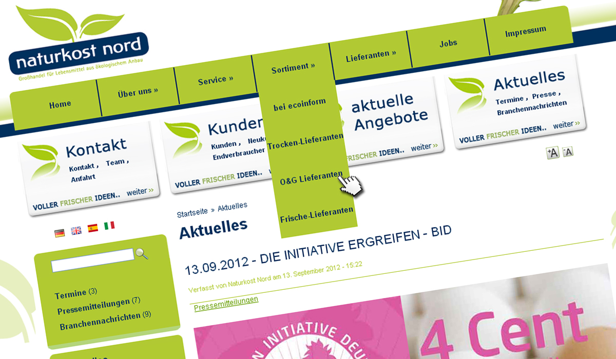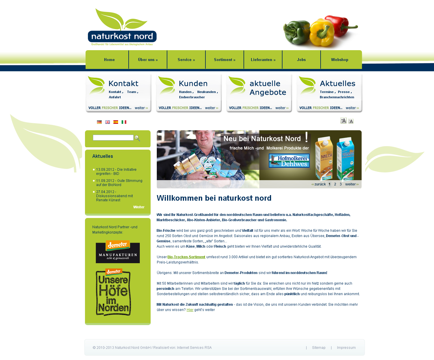 Work conducted for “Naturkost Nord” included an entire design and development of a corporate website. The website is Open-Source Content Management driven (Drupal). The Naturkost Nord website contains many customized features, which include e.g. dynamic content and media implementation, integration of over 3000 food items, a customer back-end area, language options, image slider and SEO (just to name a few).